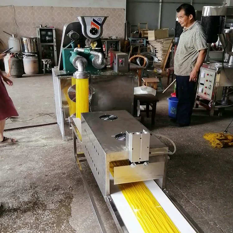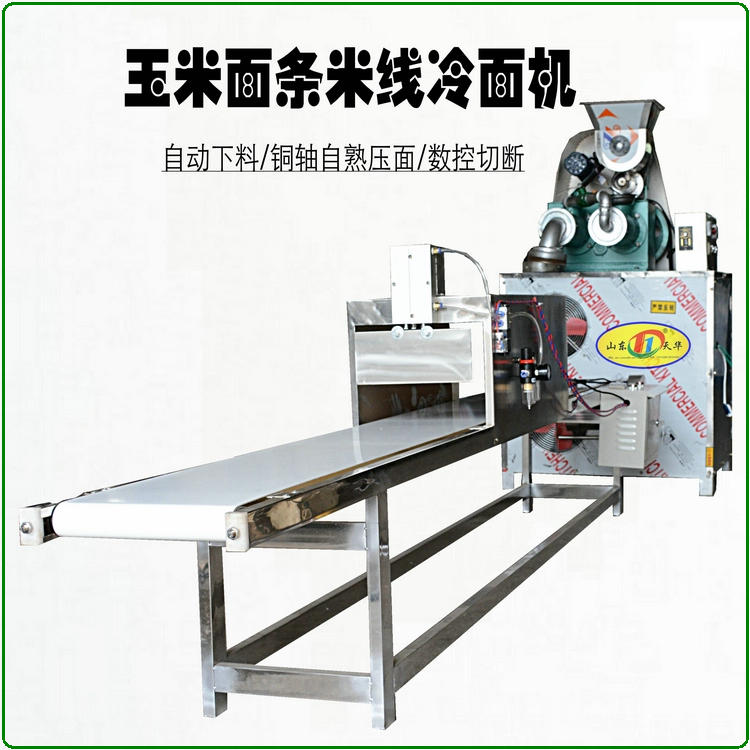 天華自熟冷面機(牛筋面機)結(jié)構(gòu)合理,造型美觀,由自動下料器、雙銅軸壓面機、數(shù)控切斷機組成,自動下料器由調(diào)速電機帶動,通過快慢速度調(diào)整喂料的多少,壓面機采用螺旋擠壓生物變性工藝,無需外加熱源,利用軸筒旋轉(zhuǎn)與原料摩擦揉擠產(chǎn)生的熱能,使原料到成品一次熟化成型,將玉米面、蕎麥面、小麥面等雜糧面通過冷面機綜合轉(zhuǎn)化成具有柔韌彈性特點的風味面食,更換不同的的模具可以加工不同粗細寬窄的形狀,產(chǎn)品外表光滑、柔軟可口、久煮不糊,保留原糧的特有營養(yǎng)成分和微量元素。自熟冷面機還可生產(chǎn)鋼絲面、牛筋面及各種雜糧面條等。成型的面食進入調(diào)速皮帶輸送機,由延時控制切斷裝置把面條切成所需的長短后即可包裝銷售。